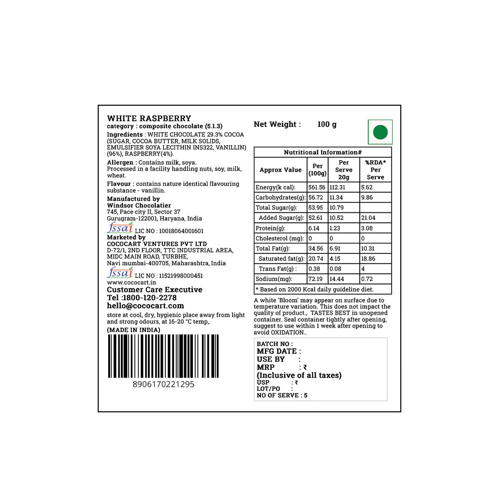 Approx Value per 100g Energy 559.2 kcal carbohydrate 57.08 g total sugar 53.73 g added sugar 52.06 g protein 6.18 g cholesterol 0 mg total fat 34.2 g saturated fat 20.52 g mufa 10.83 g pufa 1.14 g sodium 71.44 mg trans fat 0.38 g dietary fibre 2.65 g unsaturated fat 13.3 g