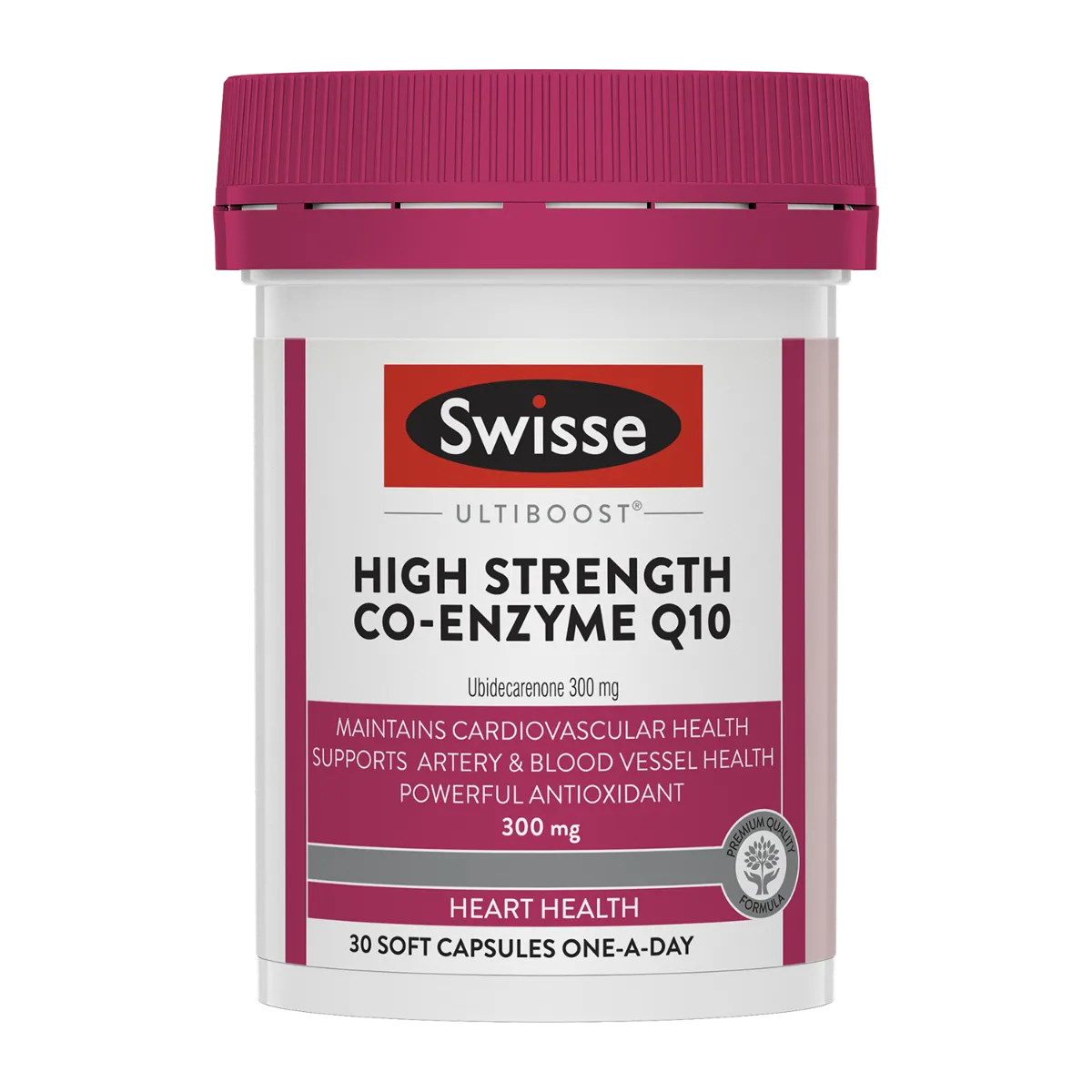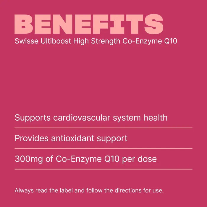 Step into a world where supporting heart health is a top priority with Swisse Ultiboost High Strength Co-Enzyme Q10. Our premium quality formula, containing 300 mg of Co-enzyme Q10, offers a convenient, one-a-day supplement to support your cardiovascular system health. Co-enzyme Q10 plays an important role in supporting energy production and maintaining the health of your arteries and blood vessels. Each capsule helps reduce free radical damage and supports general health and wellbeing. Consider making Swisse Ultiboost High Strength Co-Enzyme Q10 a part of your daily wellness journey.