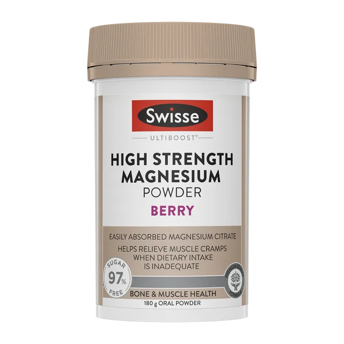 Support muscle function and relaxation with a high strength dose of magnesium. Swisse Ultiboost High Strength Magnesium Powder is a premium quality formula that contains two forms of magnesium to support muscle health and help relieve muscle cramps and mild muscle spasms when dietary intake is inadequate. It also supports nervous system health, relieves tiredness, and supports energy production. This convenient powder, which comes in a delicious natural berry flavour, is easily absorbed and provides an option for individuals with an active lifestyle who want an alternative format to tablets and capsules.