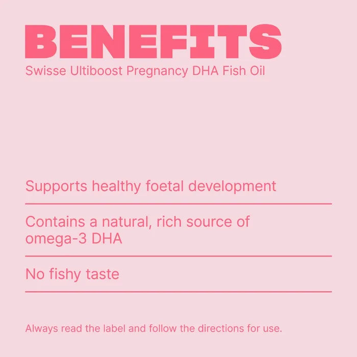 Swisse Ultiboost Pregnancy DHA Fish Oil is a premium quality supplement to help support healthy foetal development. Formulated based on scientific evidence, it contains a natural, rich source of omega-3 DHA to support healthy foetal brain development and foetal health.