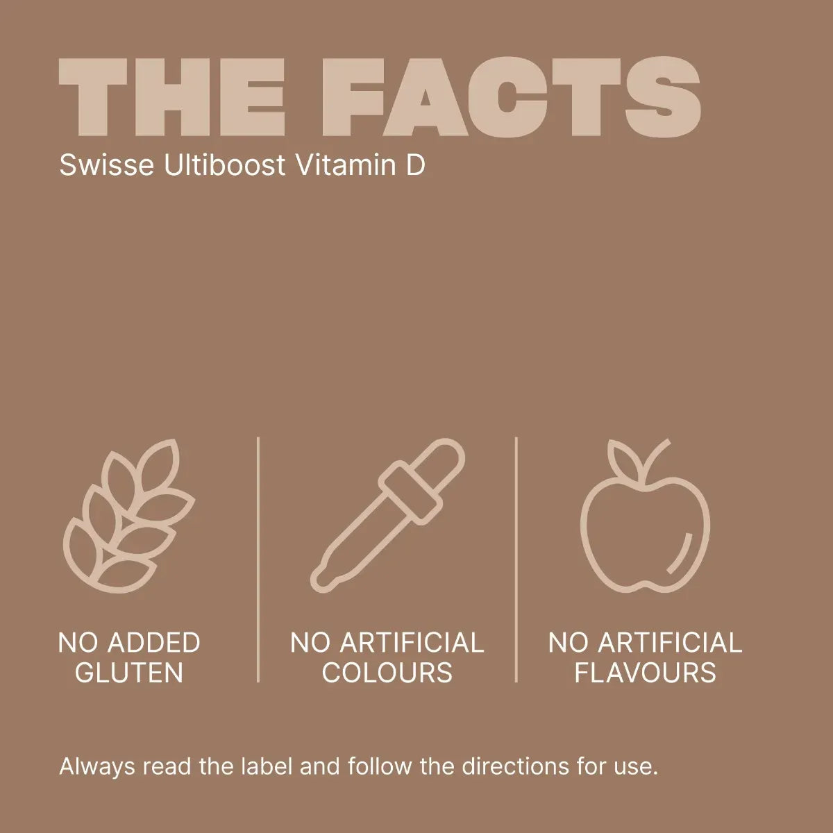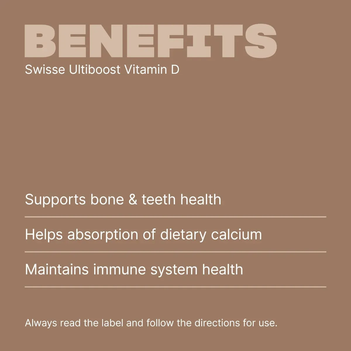 Give bones and teeth some TLC with Swisse Ultiboost Vitamin D. This premium quality formula maintains healthy bones and teeth, immune system health and function, and supports the absorption of dietary calcium. Humans produce vitamin D when the body is exposed to sunlight, however, inadequate sun exposure can mean that many people’s vitamin D levels are low, and they would benefit from an alternative source. This daily supplement is formulated with 25 micrograms of naturally derived vitamin D3, which is retained in the bloodstream more effectively when compared to vitamin D2 (a synthetic form), and so provides a convenient way of maintaining healthy vitamin D levels.