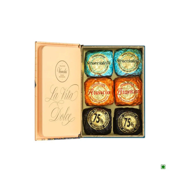 Delight in Italian luxury with the Venchi Vintage Mini Book Pack (119g), a collector’s treasure filled with Venchi’s most iconic creations — Chocoviar.