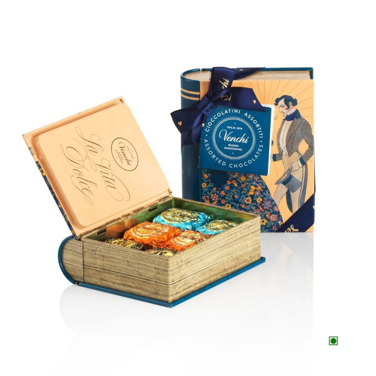 This elegant mini book tin captures the spirit of Venchi’s Italian know-how, style, and creativity, offering a sophisticated selection of assorted chocolates with rich fillings and delightful textures.